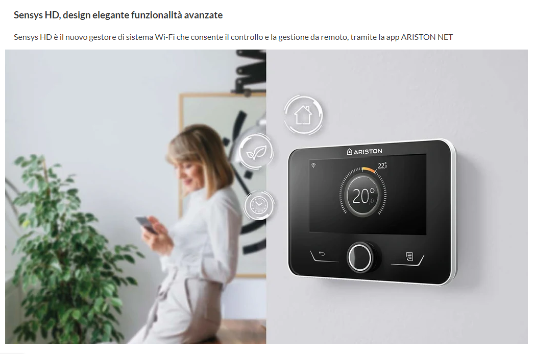 Connettività ARISTON NET: la gestione del proprio impianto da remoto è sempre garantita grazie alla connettività di serie e al Sensys HD incluso. Controllo a distanza, report dei consumi e supporto tecnico online, tutto in un’applicazione gratuita per smartphone